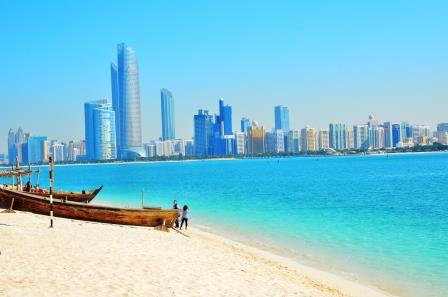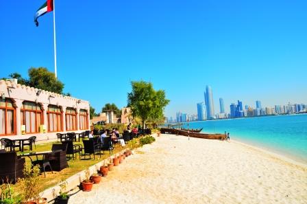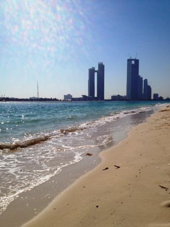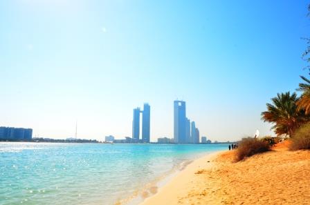 3. 砂浜とビーチでのんびりしながら、アブダビの高層ビル群を一望できる